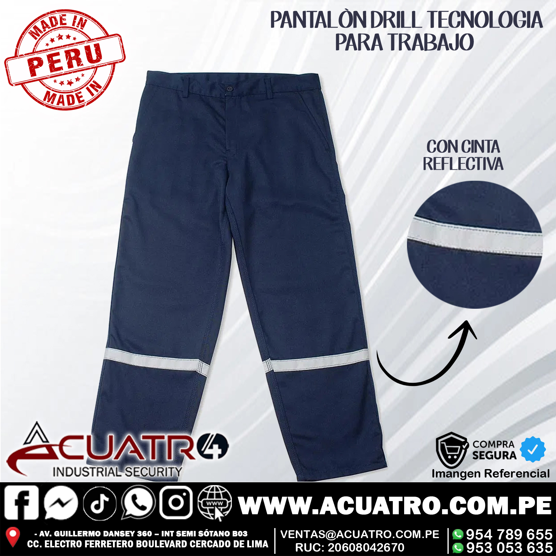 Pantalón drill tecnología de trabajo color AZUL con cinta reflectiva en ambas piernas y de triple costura, lo que le permite ofrecer una mayor durabilidad. Cuenta con 2 bolsillos para manos y 2 bolsillos traseros. Cremallera metálica y botón de plástico. Brinda comodidad y durabilidad.