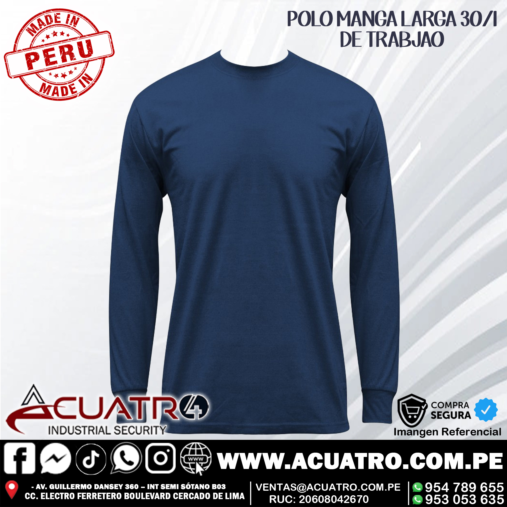 Los polos para trabajo, 30/1 están fabricados ( 35% de algodon 65% de poliester ) . Tiene el cuello redondo y la manga larga. Es súper cómodo y maximiza la transmisión de la humedad desde la piel hasta la superficie exterior del tejido. Los diseños son únicos. Ideal para trabajo de construcción, mecánica, carpintería, etc.